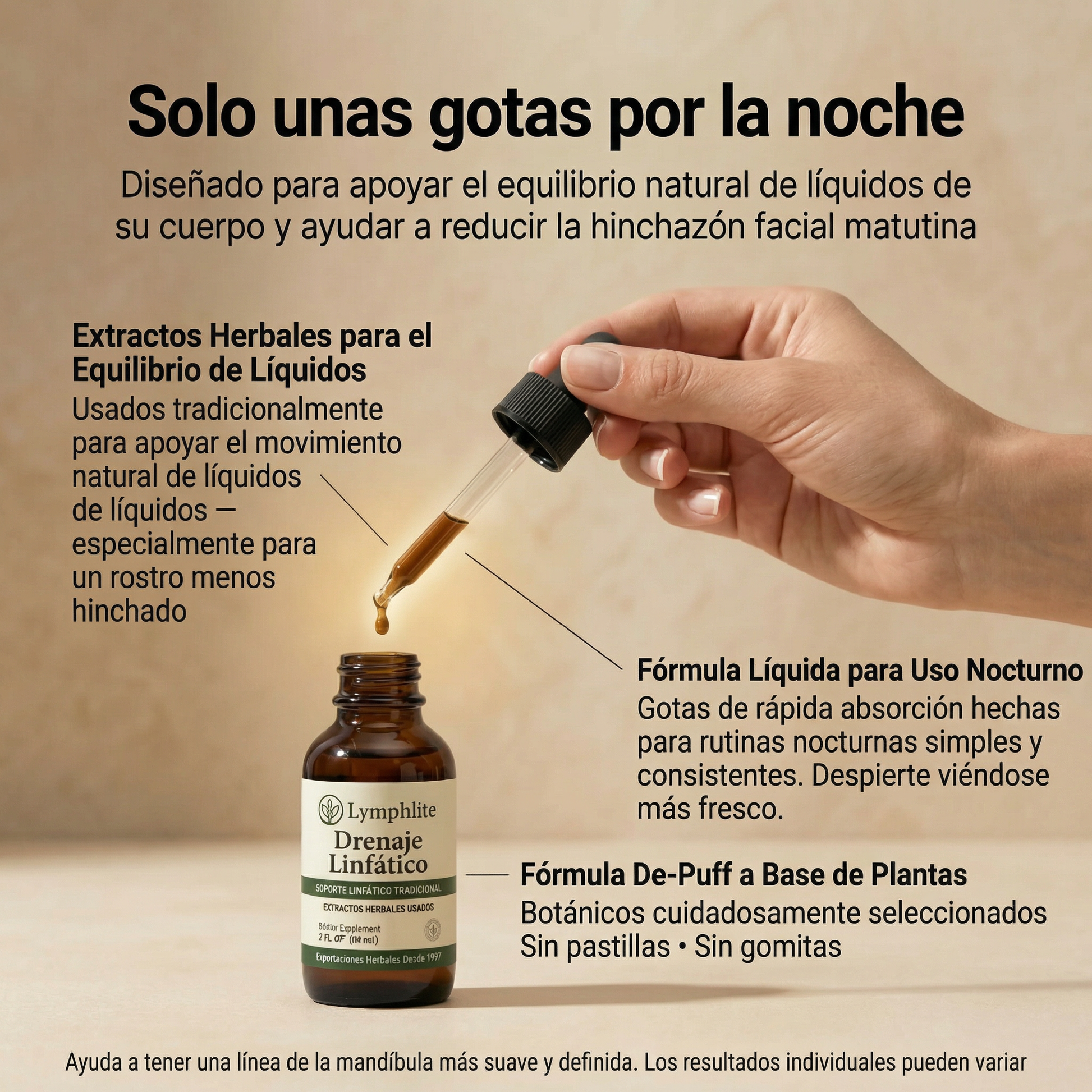 🌿 Lymphlite es un líquido herbal de uso diario diseñado para favorecer el equilibrio natural de líquidos de tu cuerpo, ayudando a que el líquido atrapado se mueva en lugar de asentarse en tu rostro durante la noche. Muchas personas notan cambios sutiles en solo unos pocos días, especialmente por la mañana. Para obtener los mejores resultados visibles, úsalo de manera constante durante al menos 90 días, y continúa su uso diario para mantener un rostro más terso y con menos apariencia de hinchazón a lo largo del tiempo.